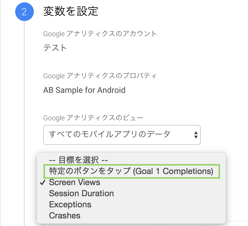 デフォルトでは、スクリーン数、セッションの長さ、例外数、クラッシュ数の四つから選ぶことができます。たとえば、スクリーン数をウェブテストの目的に設定していると、Google Analytics(以下、GA)で送信したスクリーン数が多いパターンが優秀と判定され、クラッシュ数を目的に設定していると、クラッシュ数が少ないパターンが優秀と判断されます。