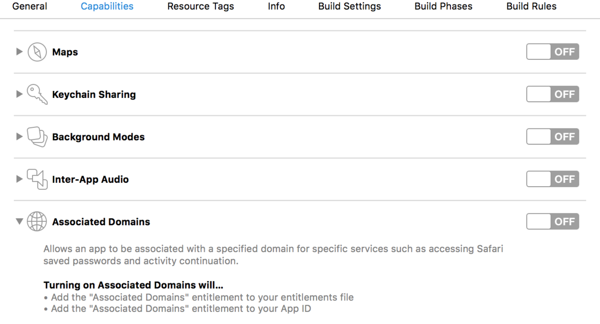 アプリケーション実装時に、”Associated Domains”を登録することで動作させます。(XCodeにて設定)