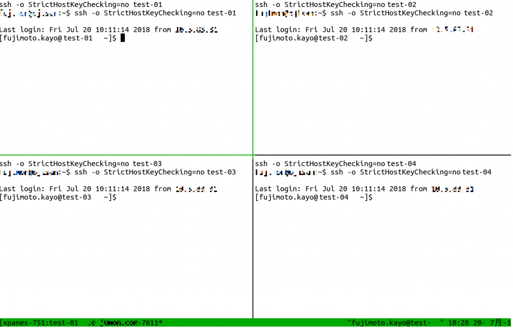 Enterを押すと、画面が4分割され、サーバ4台にログインできました。