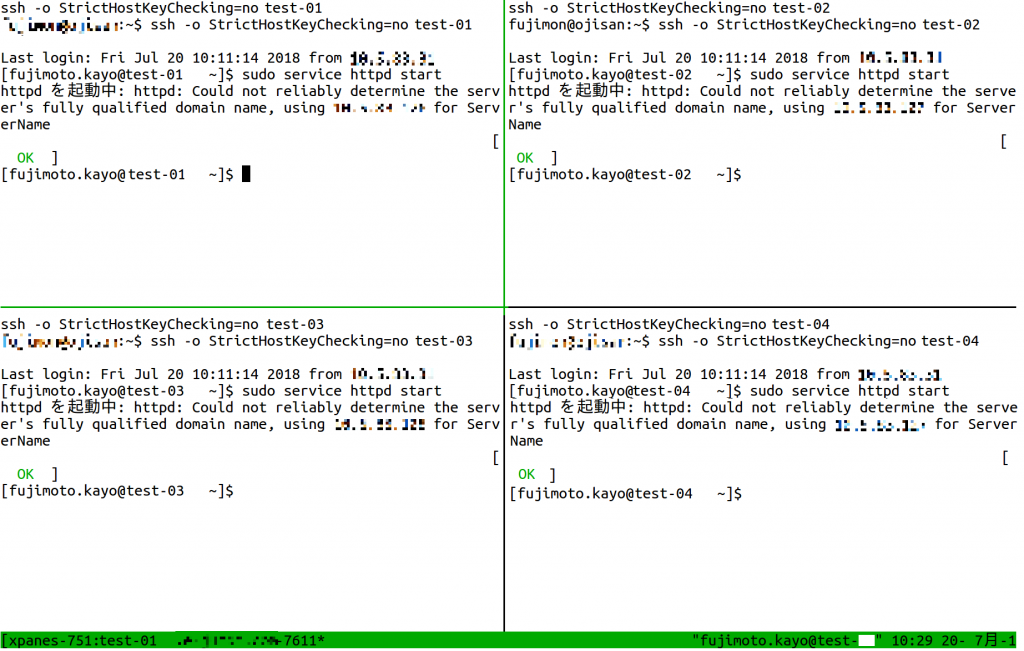 あとは、httpd起動コマンドを入力するだけですが、4サーバで同時にコマンドが打てます。