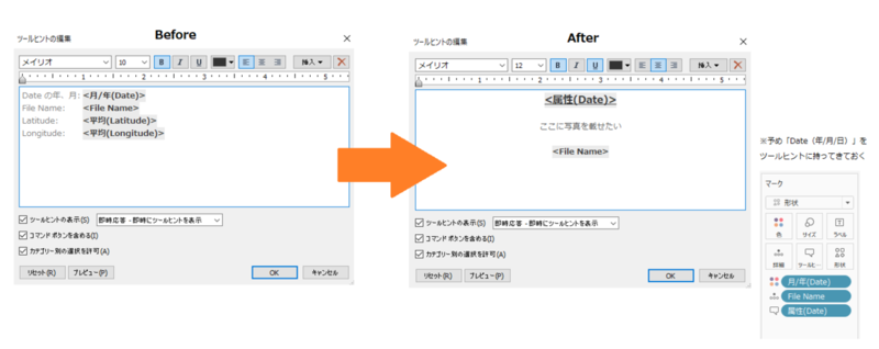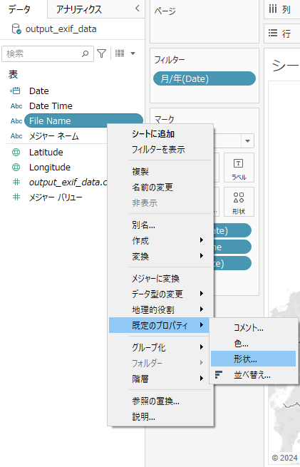 場所に応じてツールヒント内の写真を動的に表示させるには、先ほどと同様にカスタム形状に写真データを追加する必要があります(このとき、カスタム形状に追加する写真ファイル名はTableauにインポートしたデータと同じファイル名にしておく)。